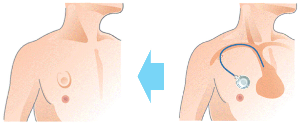 中⼼静脈カテーテルの⼀種で、正式には⽪下埋め込み型ポートといわれます。